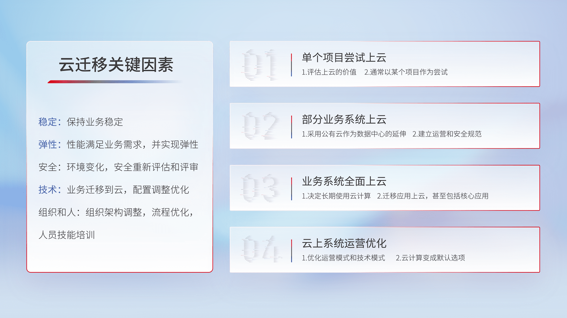 结合实际业务,,从规划设计、、云平台选型、、云原生改造、、数据迁移、、、、集成交付,,,迁移全过程为客户识别最佳上云路径,,,做好风险识别管理,,,,设计网络架构、、、身份权限、、、、安全审计合规、、、操作审计、、日志审计、、、监控告警策略、、、多站点容灾设计等,,,,对云上基础设施进行整体规划,,提升IT治理水平,,,以满足弹性、、、高可用、、、、高性能的需求。。。。