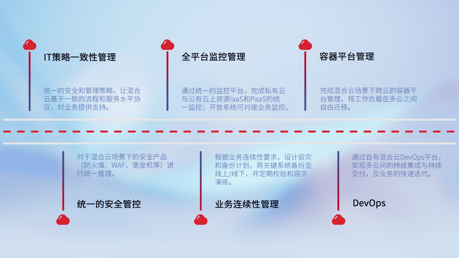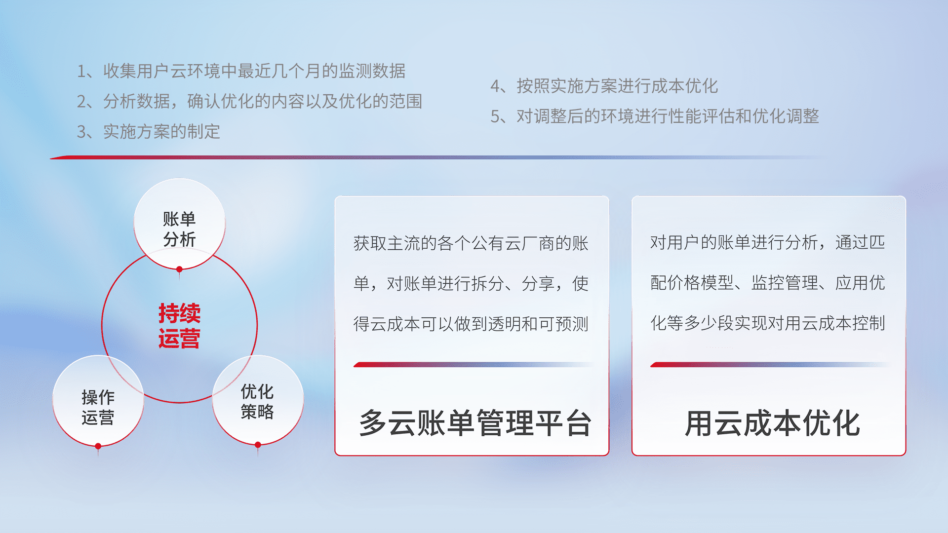 通过多云纳管,,,以统一的资源数据模型把客户的云资源进行抽象和封装,,,进而实现对多云资源的统一操作,,,,保障云资源管理的可靠性、、稳定性与可用性。。。。量身定制化运维内容,,,,配置、、、开发运维、、、补丁管理、、、备份、、、、监控、、、认证和访问管理、、、审计和日常巡检等,,保障在用云过程中的可靠度,,,稳定度以及高可用率。。