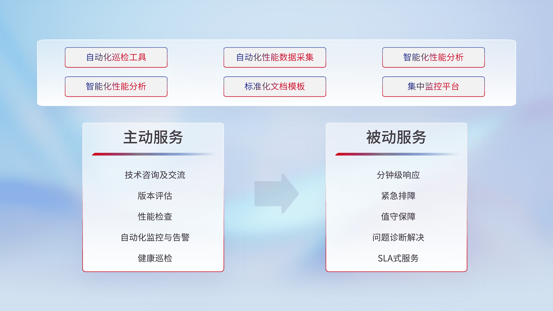 智能化工具和标准化文档,,,,保障服务质量,,,提供主动服务(包含技术咨询、、、、版本评估、、、、性能检查、、、自动化监控与告警、、、健康巡检)和被动服务包含(分钟级响应、、、、紧急排障、、、值守保障、、、问题诊断解决、、、、SLA服务)。。。。